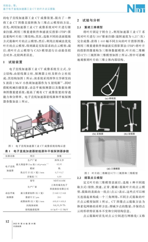 束扫描, 利用三维重建软件和滤波反投影( FBP ) 算 将叶片固定于转台上, 利用加速器工业 CT 系