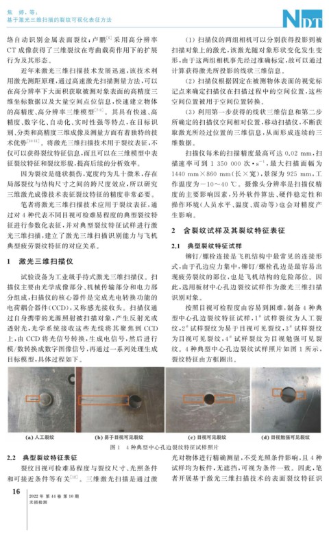 过自身携带的光源照射被扫描对象, 产生反射光或 型中心孔 边 裂 纹 特 征 试 样, 1 试 样 裂 纹 为 人 工 裂