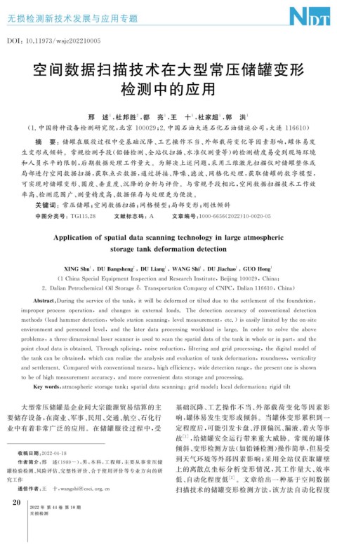 关键词:常压储罐; 空间数据扫描; 网格模型; 局部变形; 刚性倾斜