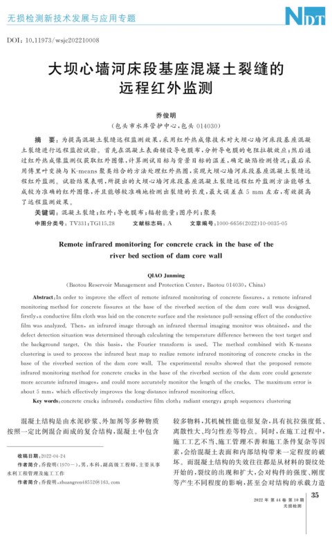 关键词:混凝土裂缝; 红外; 导电膜布; 辐射能量; 图序列; 聚类