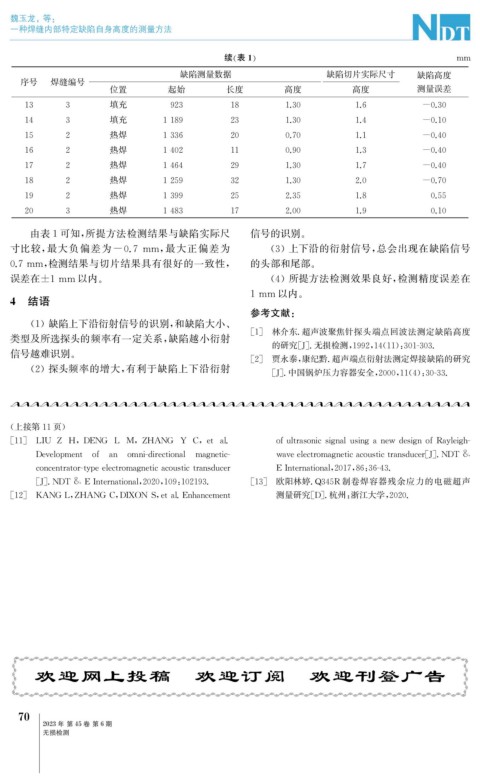 寸比较, 最大负偏差为 -0.7 mm , 最大正偏差为 ( 3 )上下沿的衍射信号, 总会出现在缺陷信号