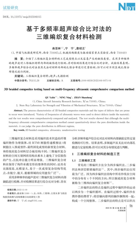 三维编织复合材料是采用编织技术织造的纤维 分析多频率超声综合比对法对材料内部缺陷定性定量