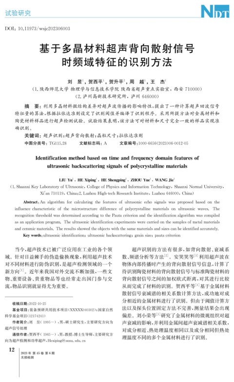 关键词: 超声识别; 超声背向散射; 晶粒尺寸; 拉依达准则