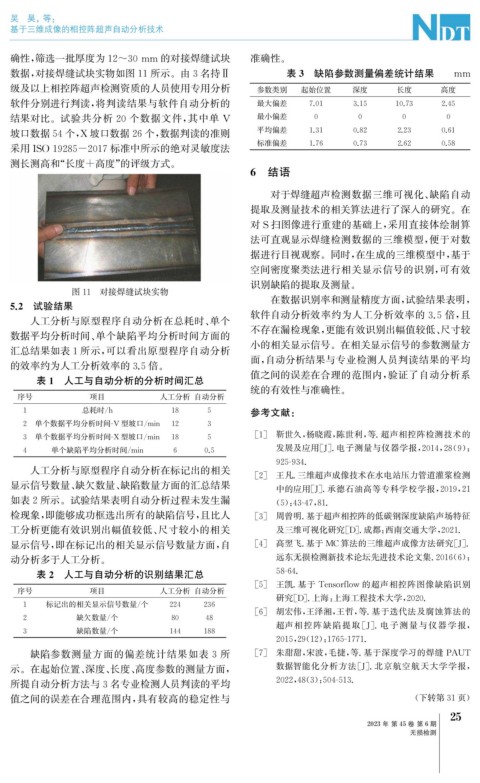 数据, 对接焊缝试块实物如图11所示。由3名持Ⅱ 表3 缺陷参数测量偏差统计结果 mm