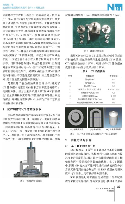 方法, 实现了 CT 图像分割。区域分割法有区域生 采用 CD-130BX 型 CT 系统对燃油喷嘴顶部进