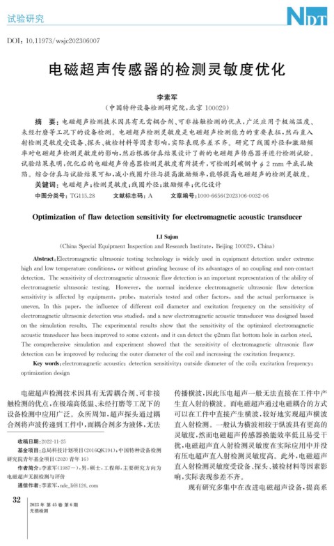 关键词: 电磁超声; 检测灵敏度; 线圈外径; 激励频率; 优化设计