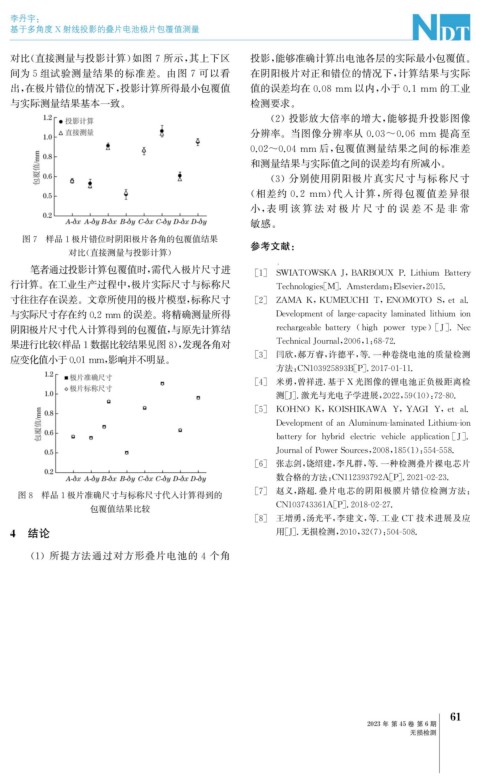 对比( 直接测量与投影计算) 如图7所示, 其上下区 投影, 能够准确计算出电池各层的实际最小包覆值。
