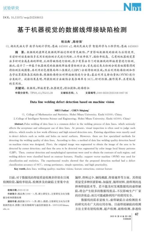 关键词: 数据线; 焊接质量; 机器视觉; 特征提取; 轮廓特征