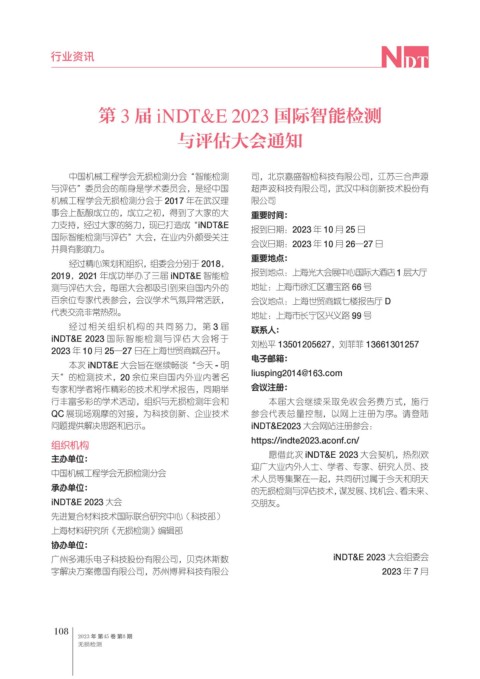 iNDT&E 2023 国际智能检测与评估大会将于 刘松平 13501205627,刘菲菲 13661301257