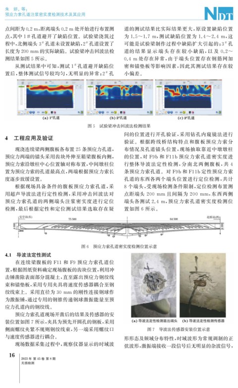 用超声导波法进行定性检测, 采用冲击回波法对 点距端头 200 mm 且间隔为 200 mm , 东西两侧