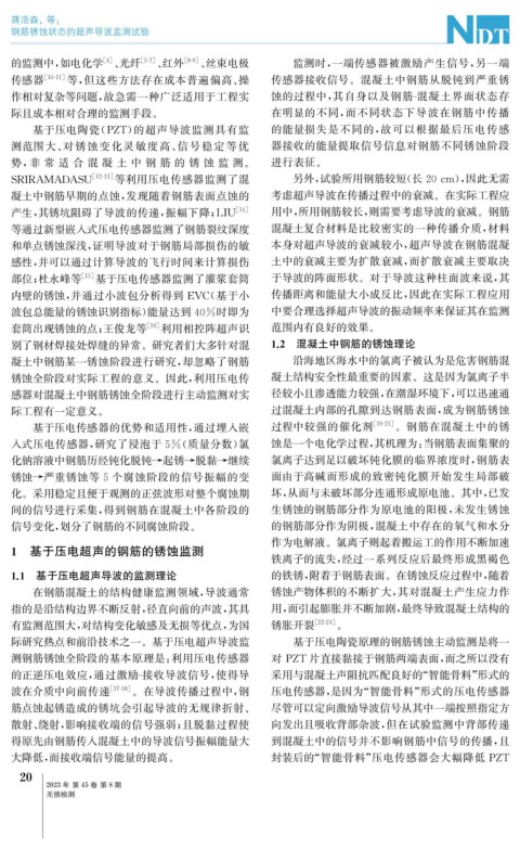 际研究热点和前沿技术之一。基于压电超声导波监 基于压电陶瓷原理的钢筋锈蚀主动监测是将一