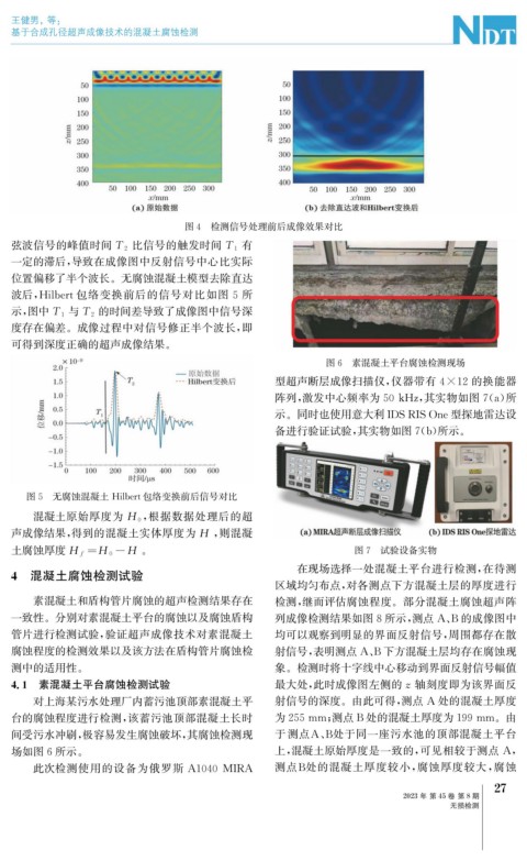 素混凝土和盾构管片腐蚀的超声检测结果存在 检测, 继而评估腐蚀程度。部分混凝土腐蚀超声阵