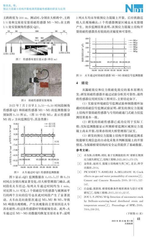 1 / 4处和支座处安装弱磁传感器 M1~M3 , 在主跨 检人员现场确认, 3 个传感器测量区域也未见裂缝