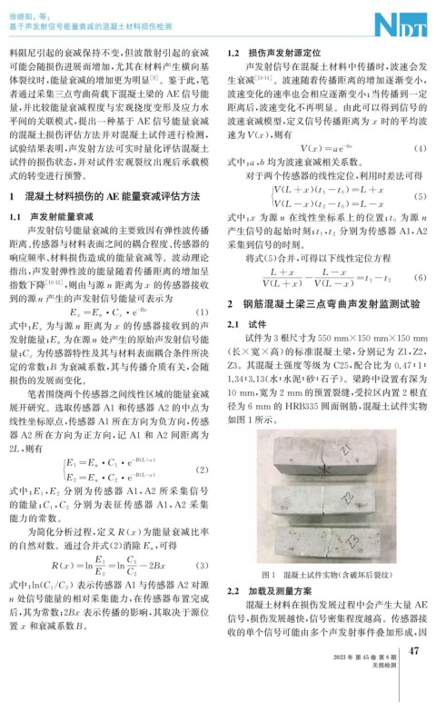 1 混凝土材料损伤的 AE能量衰减评估方法 V ( L+x )( t 1- t 0 = L+x ( 5 )