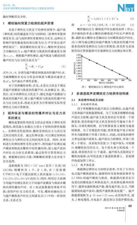 2 超声纵波与横波的传播声时比与应力关 主机和超声波换能器构成。为了实现多根螺栓的超