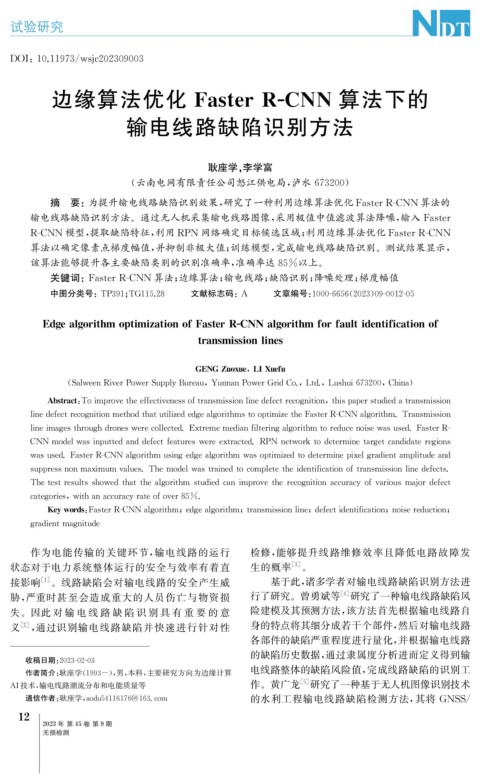 关键词: FasterR-CNN 算法; 边缘算法; 输电线路; 缺陷识别; 降噪处理; 梯度幅值