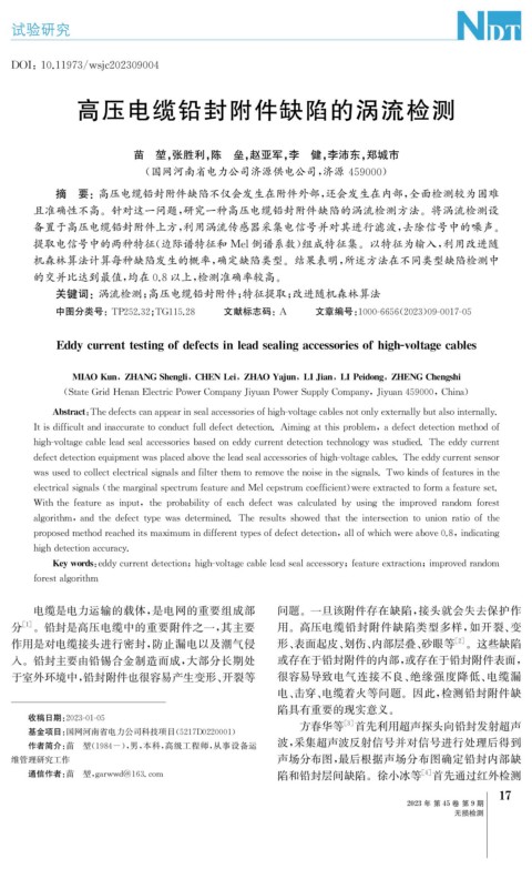 关键词: 涡流检测; 高压电缆铅封附件; 特征提取; 改进随机森林算法