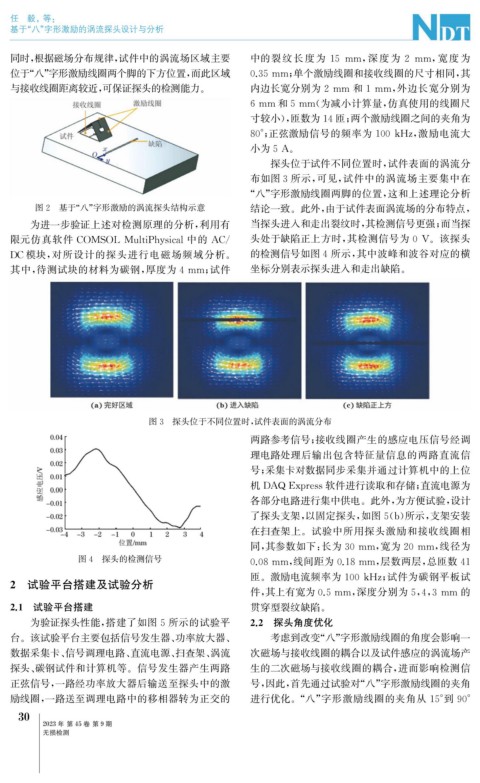 限元仿真软件 COMSOL MultiPh y sical中的 AC / 头处于缺陷正上方时, 其检测信号为 0V 。该探头