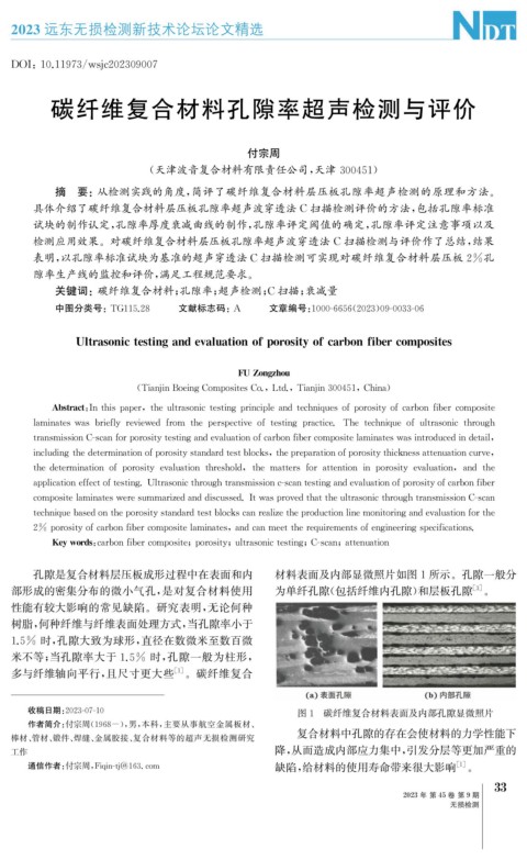 检测应用效果。对碳纤维复合材料层压板孔隙率超声波穿透法 C 扫描检测与评价作了总结, 结果