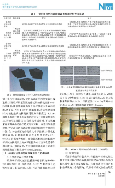 图2 典型碳纤维复合材料孔隙率标准试块套组 ( 见图4 ); 探头: 频率为5MHz , 直径为0.75in. , 焦距