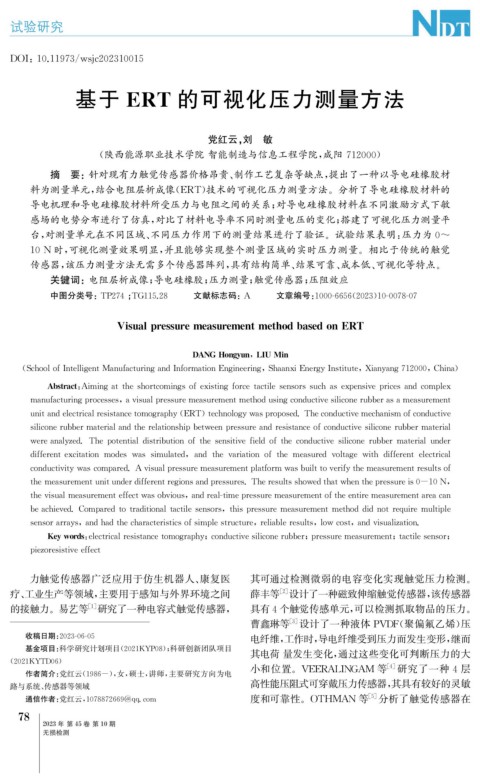 料为测量单元, 结合电阻层析成像( ERT ) 技术的可视化压力测量方法。分析了导电硅橡胶材料的