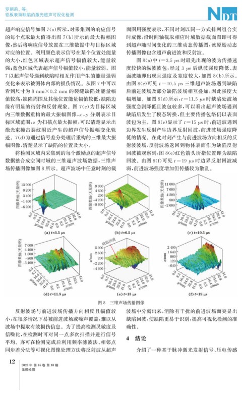 变化来表示被测体内部的损伤情况。从图7中可以 由图8 ( c ) 可见t=10.5 μ s三维超声波场遇到缺陷