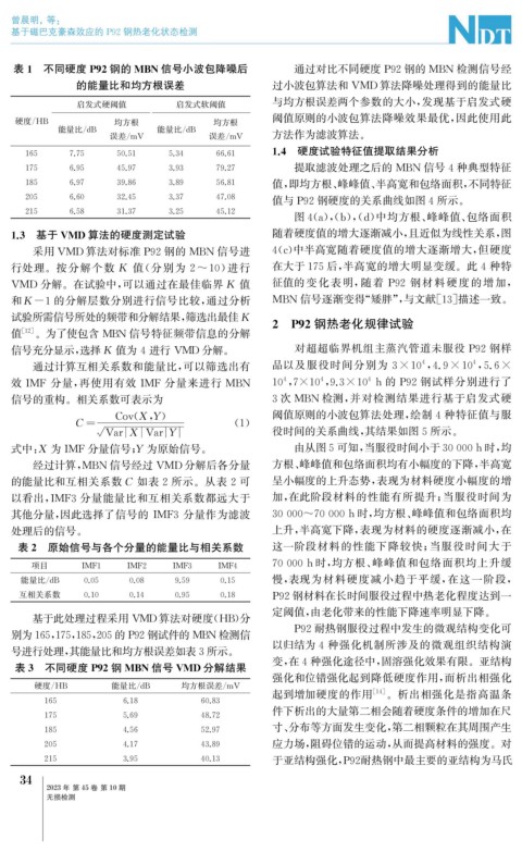 表1 不同硬度 P92钢的 MBN 信号小波包降噪后 通过对比不同硬度 P92钢的 MBN 检测信号经