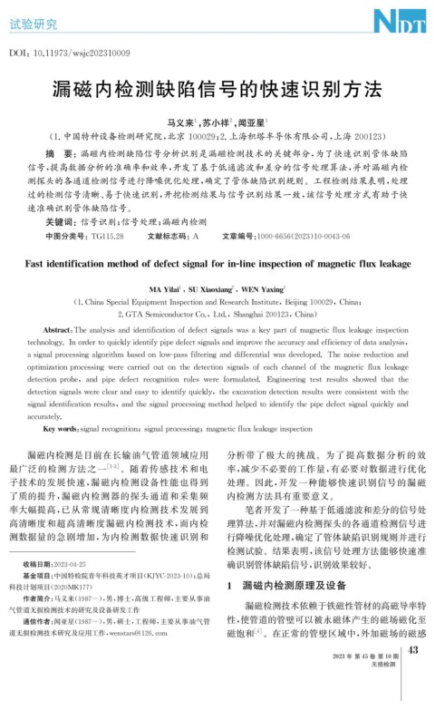 子技术的发展快速, 漏磁内检测设备性能也得到 处理。因此, 开发一种能够快速识别信号的漏磁