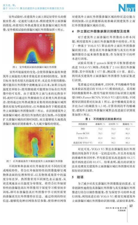的渗漏真实红外图像特征信息。通过得到的特征 行训练, 利用改进后的 YOLO V5模型实现建筑外