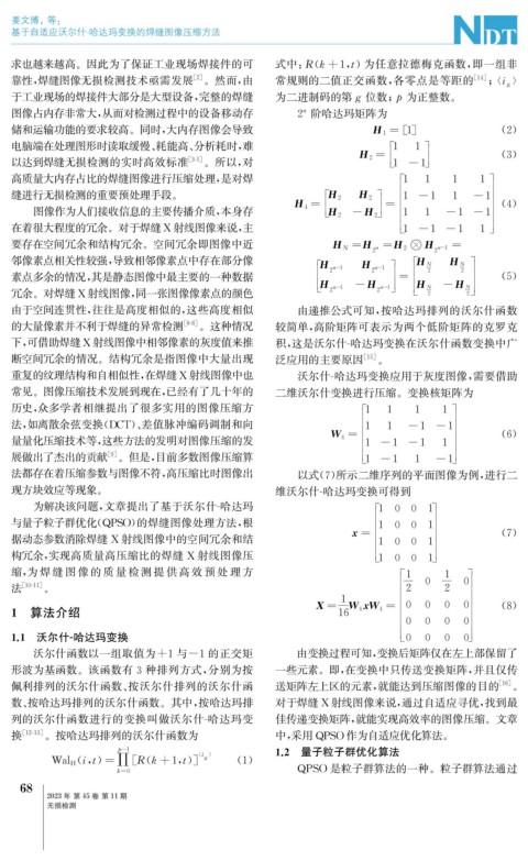 下, 可借助焊缝X射线图像中相邻像素的灰度值来推 积, 这是沃尔什 - 哈达玛变换在沃尔什函数变换中广