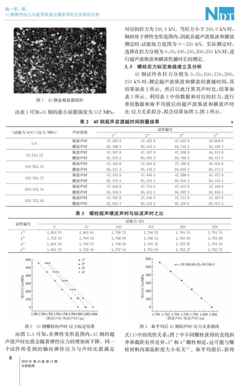 由图2 , 3可知, 在弹性变形范围内, 45 钢的超 式( 1 ) 中的线性关系; 图2中不同螺栓获得的直线斜