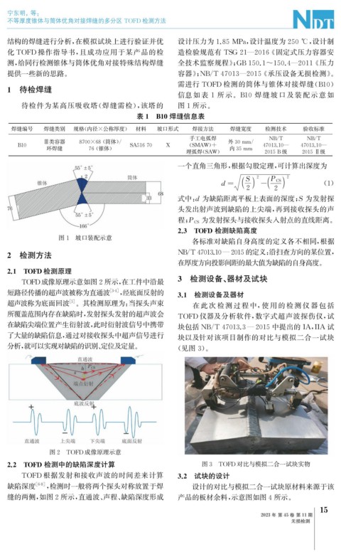 TOFD成像原理示意如图2所示, 在工件中沿最 3 检测设备、 器材及试块