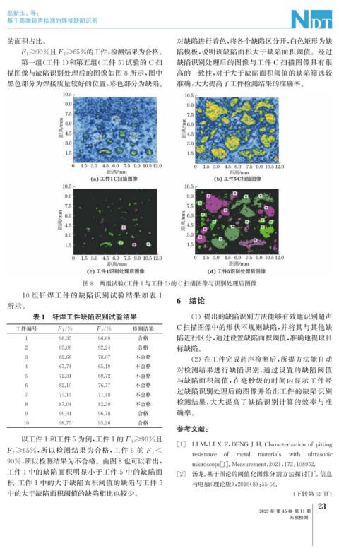 1 98.35 96.69 合格 陷进行区分, 通过设置缺陷面积阈值, 准确地提取目