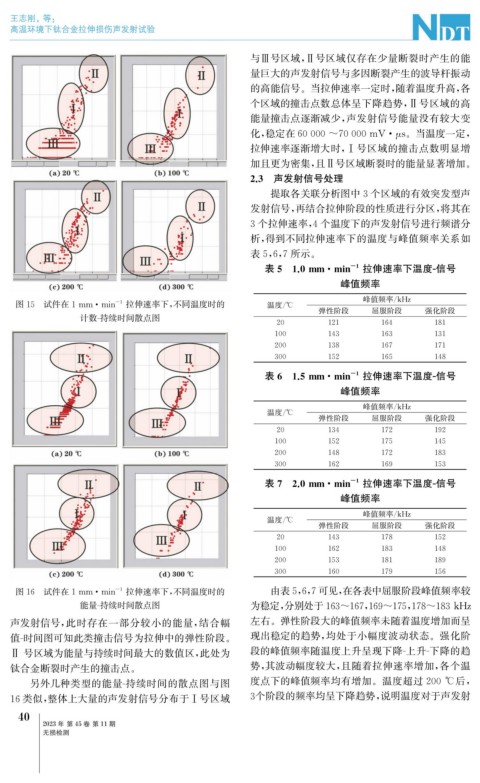 声发射信号, 此时存在一部分较小的能量, 结合幅 左右。弹性阶段大的峰值频率未随着温度增加而呈