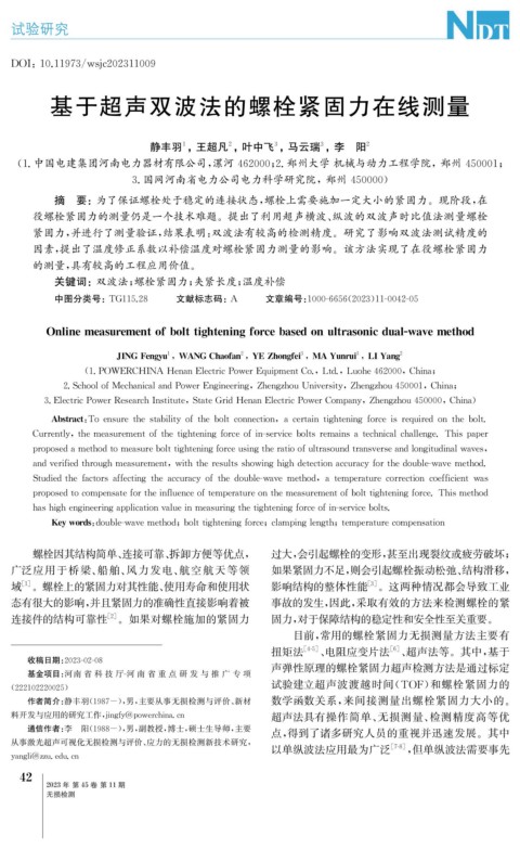 Ke ywords : double-wavemethod ; boltti g htenin g force ; clam p in g len g th ; tem p eraturecom p ensation