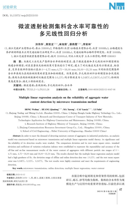 摘 要: 为满足工业化生产集料含水率的检测需求, 基于微波透射和多元线性回归模型理论