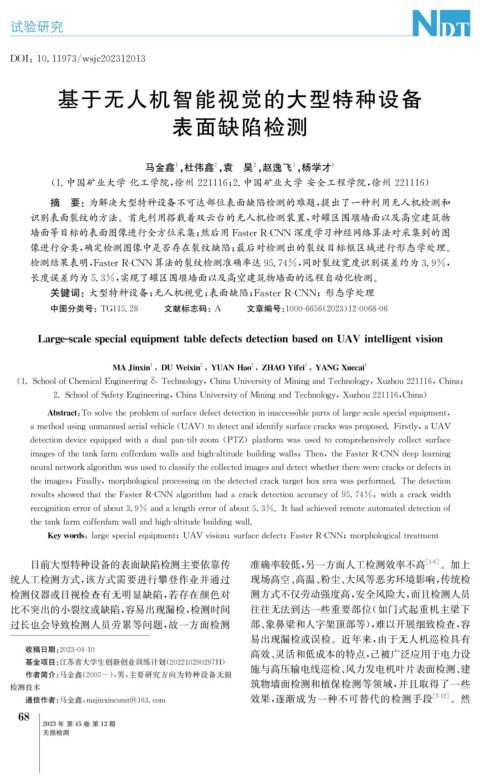 关键词: 大型特种设备; 无人机视觉; 表面缺陷; FasterR-CNN ; 形态学处理