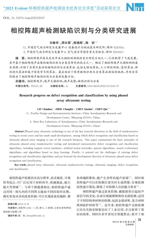 其中基于相控阵超声成像的缺陷识别与分类是研究的热点之一。概述了相控阵超声无损检测的基