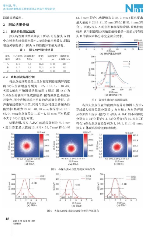 结果表明, 探头 A , B , C 的场深分别为75.2mm 符合); 探头焦点直径分别为1.36 , 1.31 , 1.42mm ,
