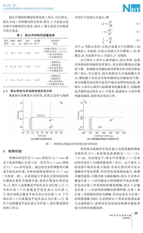 聚焦探头的聚焦区呈柱状, 其焦点直径与场深 性能如场深、 焦距均在要求之外。