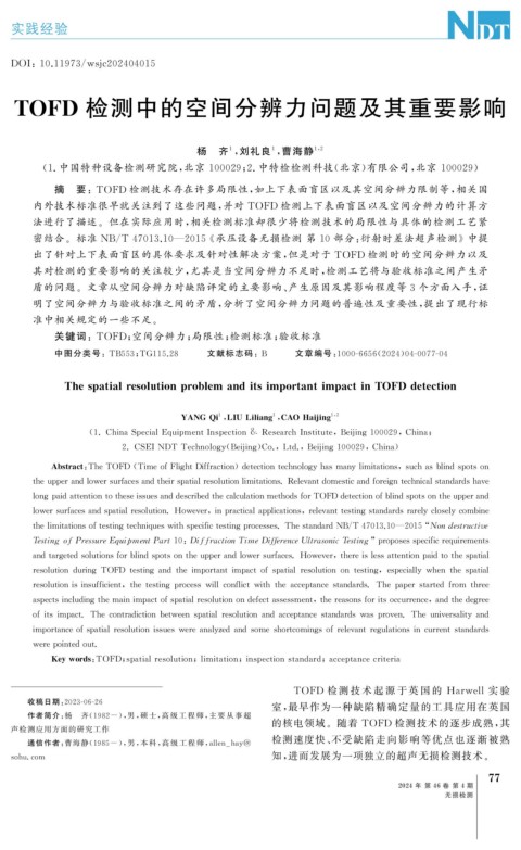 关键词: TOFD ; 空间分辨力; 局限性; 检测标准; 验收标准