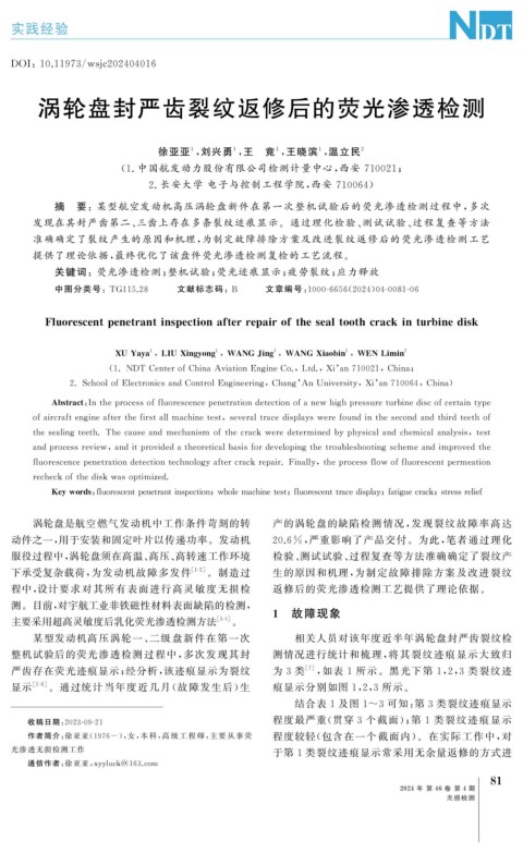关键词:荧光渗透检测; 整机试验; 荧光迹痕显示; 疲劳裂纹; 应力释放