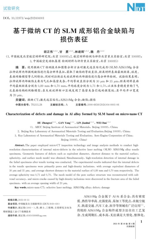 关键词: 微纳 CT ; 激光选区熔化; AlSi10M g 合金; 缺陷; 损伤