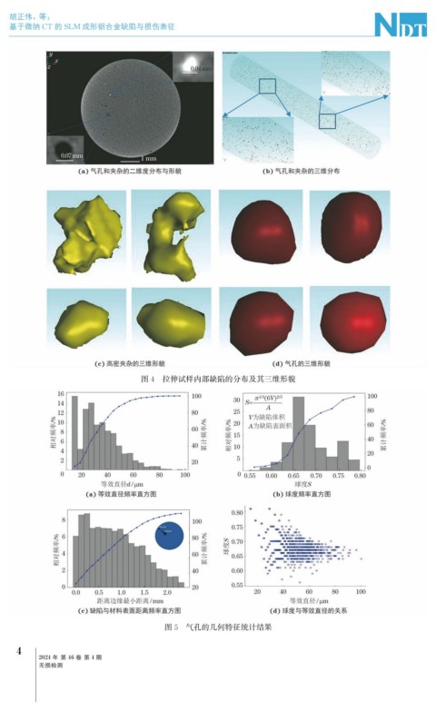 胡正伟, 等: 基于微纳 CT 的 SLM 成形铝合金缺陷与损伤表征 图4 拉伸试样内部缺陷的分布及其三维形貌 图5 气孔的几何特征统计结果 4 2024年 第46卷 第4期 无损检测