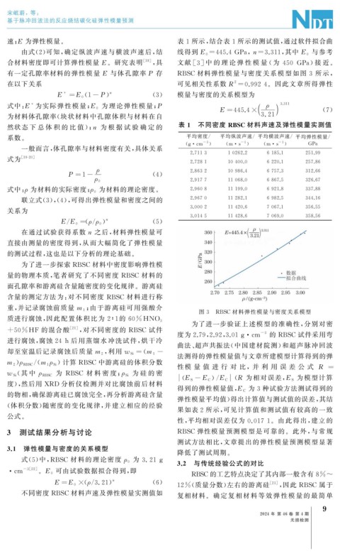 然状态 下 总 体 积 的 比 值); n 为 根 据 试 验 确 定 的 表 1 不同密度 RBSC 材料声速及弹性模量实测值