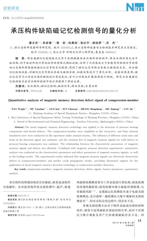 关键词:承压构件; 磁记忆检测; 缺陷信号; 特征参数; 定量分析