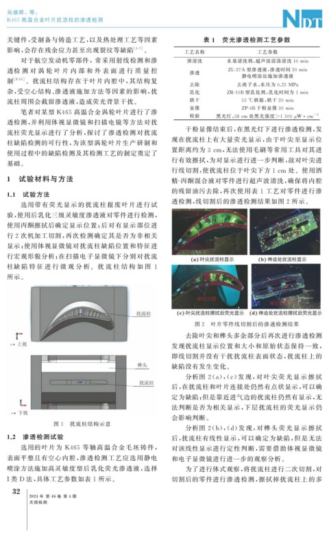 I类 D 法, 具体工艺参数如表 1 所示。 切割后的零件进行渗透检测, 擦拭掉扰流柱上的多