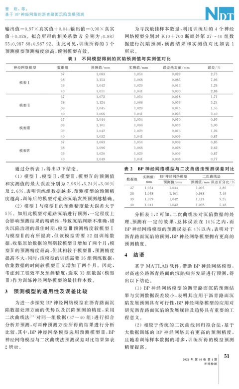 为进一步探究 BP 神经网络模型在沥青路面沉 陷发展预测具有可行性, BP 神经网络模型的应用对