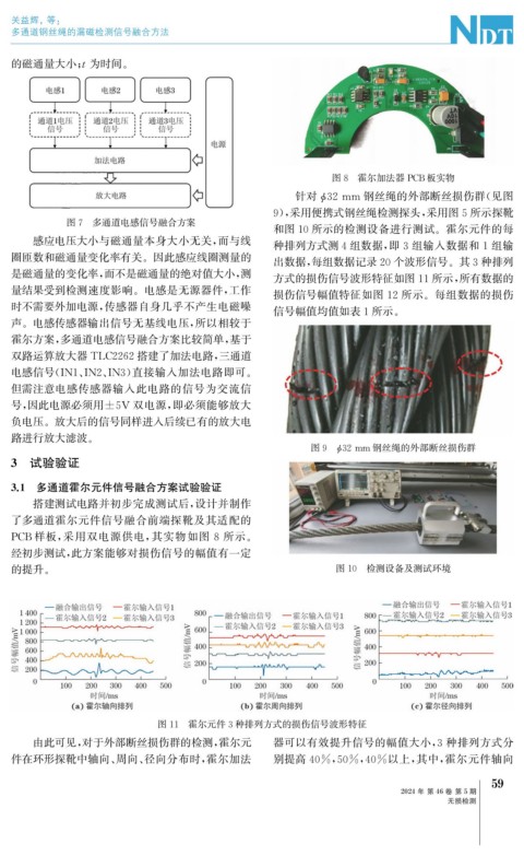由此可见, 对于外部断丝损伤群的检测, 霍尔元 器可以有效提升信号的幅值大小, 3 种排列方式分