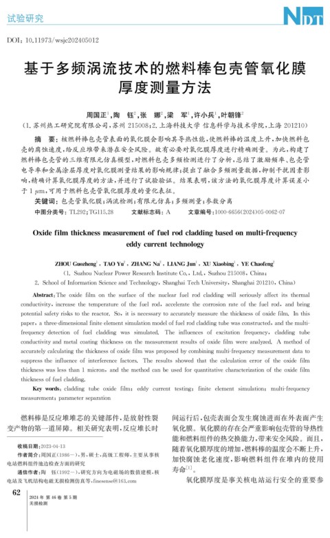 关键词: 包壳管氧化膜; 涡流检测; 有限元仿真; 多频测量; 参数分离